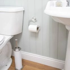 This Croydex Stick N Lock Toilet Roll Holder is installed in three easy steps – peel, stick and fix – each piece in the chrome-plated mild steel collection comes with a five-year rust-free guarantee. Thanks to the self-adhesive fixing plate, no tools or fixings are required. Simply stick to a clean, stable, flat, finished surface and once in place, hang the accessory and secure using the screw-on cover cap.
