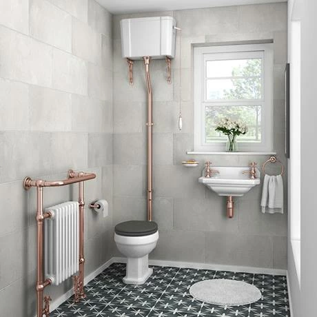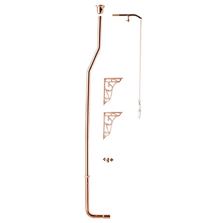 A rose gold plated traditional Victorian style high level WC flush pipe set, perfect for providing a period look in any home, includes a high level flush pipe, fulcrum lever, chain pull and ornate cistern support brackets.