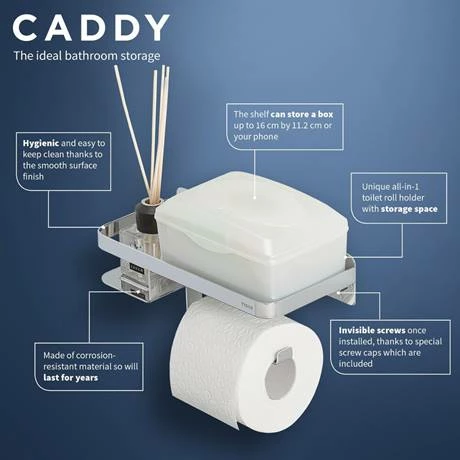 The unique Tiger Caddy Toilet Roll Holder with Shelf. This all-in-one toilet solution offers space for fragrance sticks, your mobile phone, wipes or even a storage box sanitary products. Bring the modern look to your bathroom with this variant in chrome.