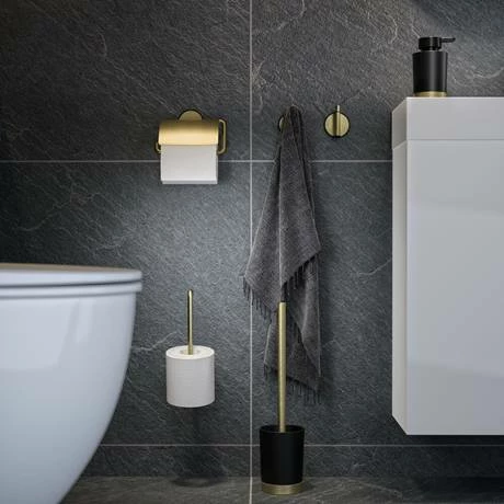 The Tiger Tune spare roll holder features a brushed brass finish, combined with matt black accents. With this accessory, two extra rolls of toilet paper can be neatly stored near your toilet. The spare roll holder is provided with strong double-sided 3M tape, which makes mounting on any smooth, solid surface very easy. If the substrate is not suitable for the application of the double-sided tape, it is possible to mount the spare roll holder on the wall with screws and plugs.